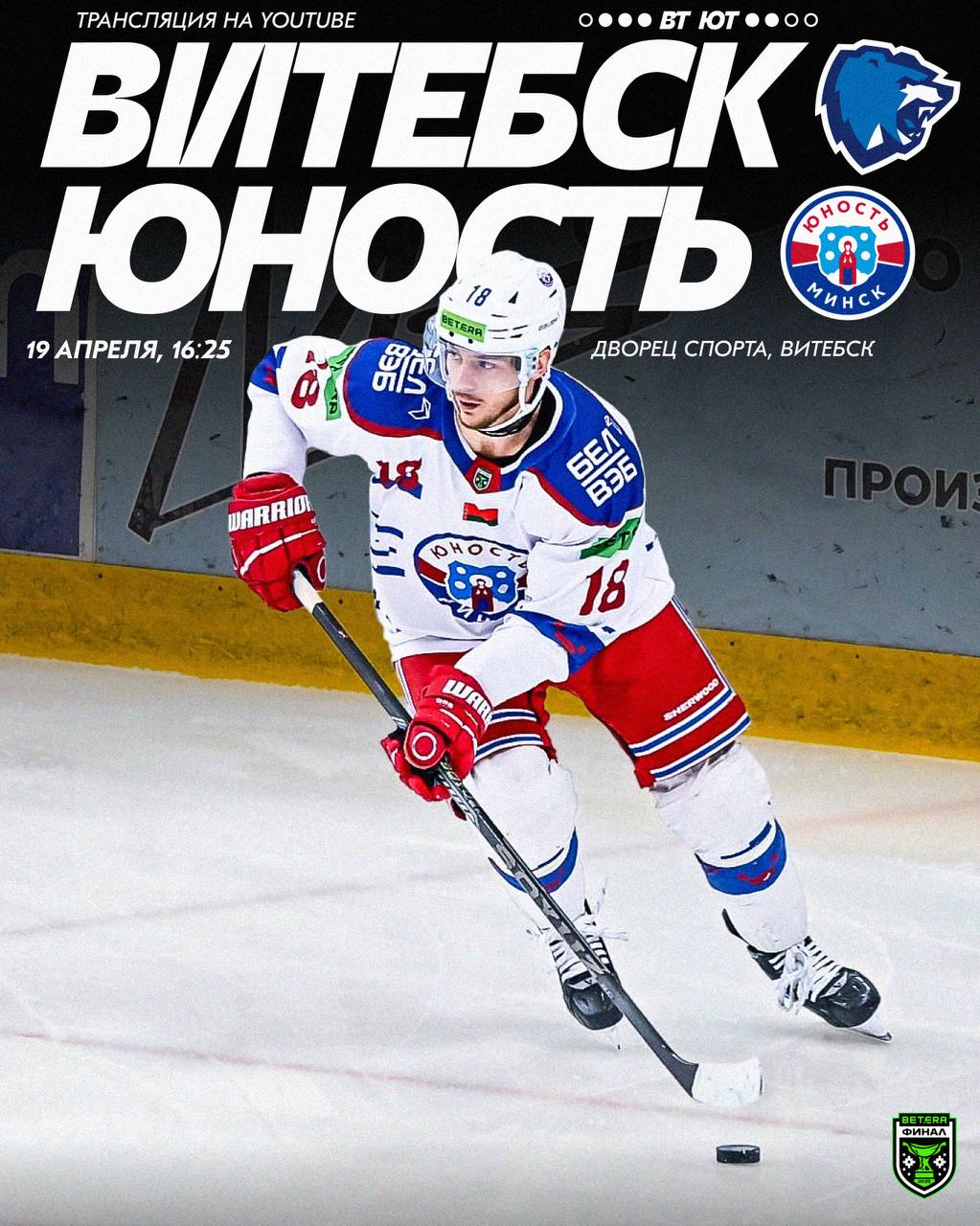Матч Юность 19 апреля 2025 Еще ничего не потеряно! Надо сравнивать счет в серии! Витебск – Юность 19 апреля. Витебск, Дворец спорта. Начало – в 16:25. Счет в серии: 3-2 (4:2, 1:3, 2:1, 4:3 ОТ, 1:3)