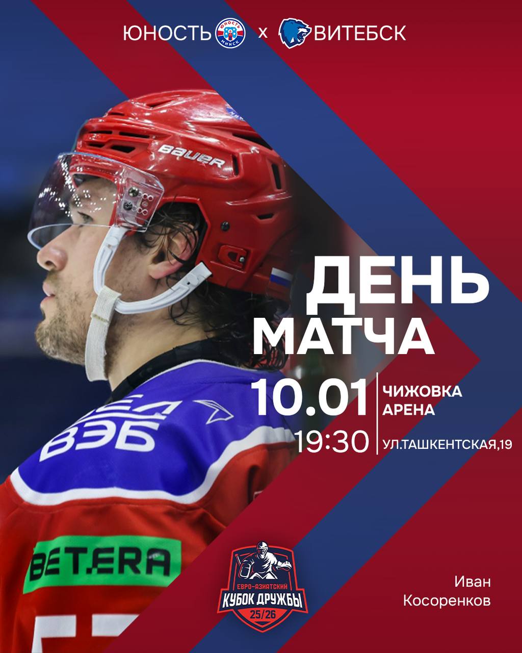 Матч Юность 10 января 2026 Кубок Дружбы! Начинаем! Юность / Витебск 10 января, 19:30 Минск. «Чижовка-Арена» Трансляция на YouTube-канале «Хоккей Беларуси», «Беларусь 5».