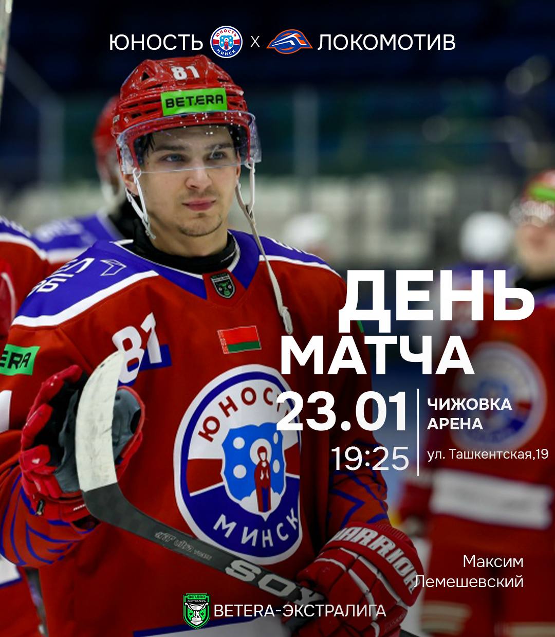Матч Клуб Юность 23 января 2026 Сегодня снова играем! «Юность» - «Локомотив» 23 января, 19:25 Минск. Чижовка-Арена Трансляция на YouTube-канале «Хоккей Беларуси | Экстралига»