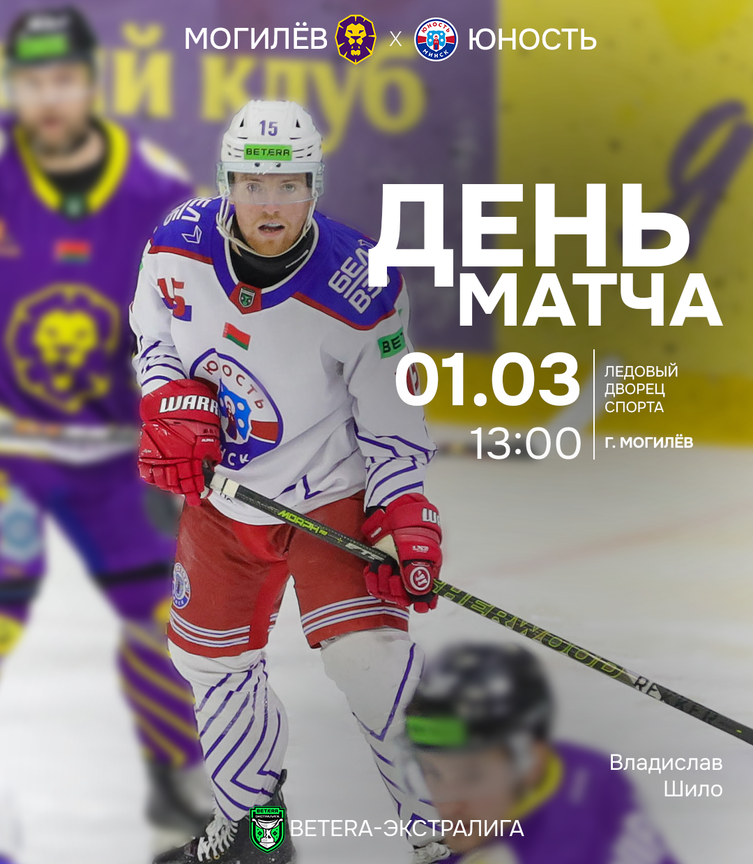 Матч Юность 01 марта 2026 Последний матч в регулярном чемпионате «Могилев» - «Юность» 1 марта, 13:00 Могилев. Ледовый Дворец Трансляция на YouTube-канале «Хоккей Беларуси | Экстралига»