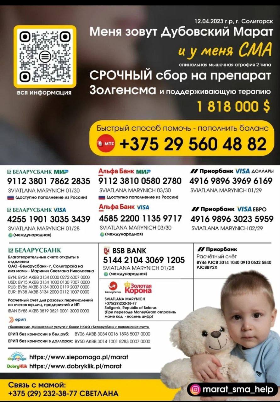 Открыт СРОЧНЫЙ сбор средств на спасительный укол для маленького солигорчанина Марата